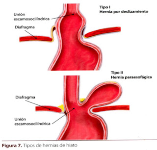 La hernia de hiato es la herniación de un órgano abdominal, generalmente el estómago, a través del hiato esofágico. El diagnóstico se basa en los estudios radiográficos con contraste. Existen dos tipos principales: por deslizamiento y paraesofágica (Figura 7).